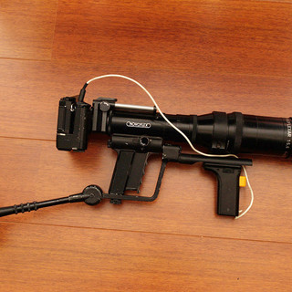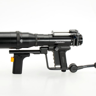 That thing that looks like a Bazooka is a Novoflex action follow focus pistol grip system. It was made for 2 types of Leica Telyt lens heads, the 6,8 / 400 and Telyt 6,8 / 560. Novoflex is a German maker of camera accessories. It is renowned for its macro bellows and makes tripods and tripod heads, flash systems, tilt-shift bellows, lens adapters and other parts. Its still in existence today (homepage listed below).